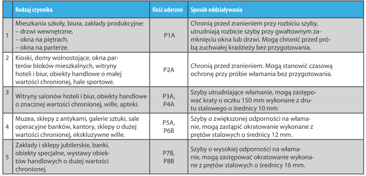 Szyba bezpieczna – po pierwsze trudno ją rozbić, a jeśli już się to zdarzy, to rozsypuje się na drobne niekaleczące kawałki lub zostaje zatrzymana w płaszczyźnie okna (podobnie jak szyba samochodowa). Szyby klasy P1 i P2 dodatkowo utrudniają przypadkowe zbicie przy gwałtownym zamknięciu okna oraz utrudniają włamanie.